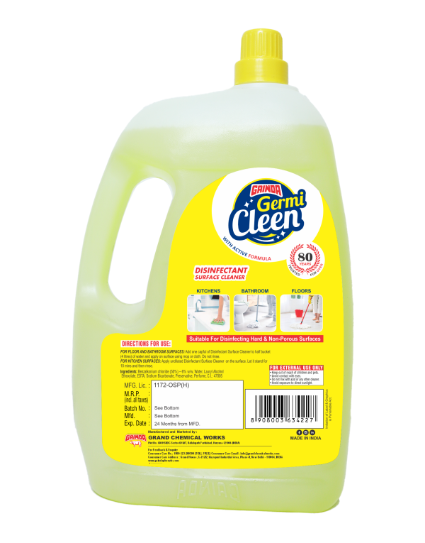 Germi Cleen Disinfectant Surface Cleaner is a very effective disinfectant surface cleaner for floors, bathroom and kitchen surfaces to remove dirt, tough stains and make your home healthier as it kills 99.9% of germs. It can be used directly on stains for spot cleaning, or diluted in water for use on hard surfaces like bath tubs, toilets, wash-basins, showers, kitchen sinks and counter tops etc.